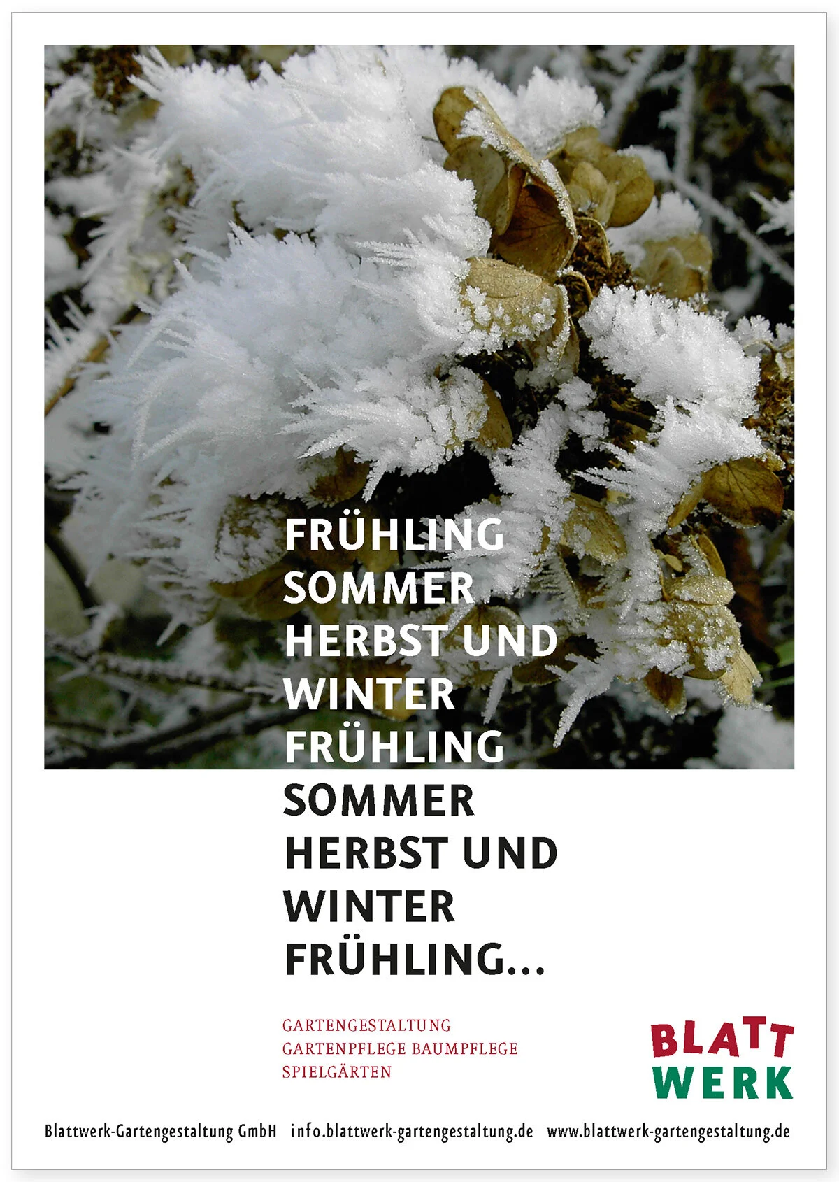 Neben der Vermittlung des Leistungsspektrums stand die authentische Darstellung dessen, was Blattwerk ist und ausmacht, im Vordergrund. Neben Referenzen und der Beschreibung, wie es vom Plan zum reifen Garten kommt, gibt es Kundenzitate, Zurufe, Unterhaltsames und Wissenswertes in kleinen „Text-Splittern“. Die Typografie nimmt diese ganz unterschiedlichen Inhalts-Ebenen auf.